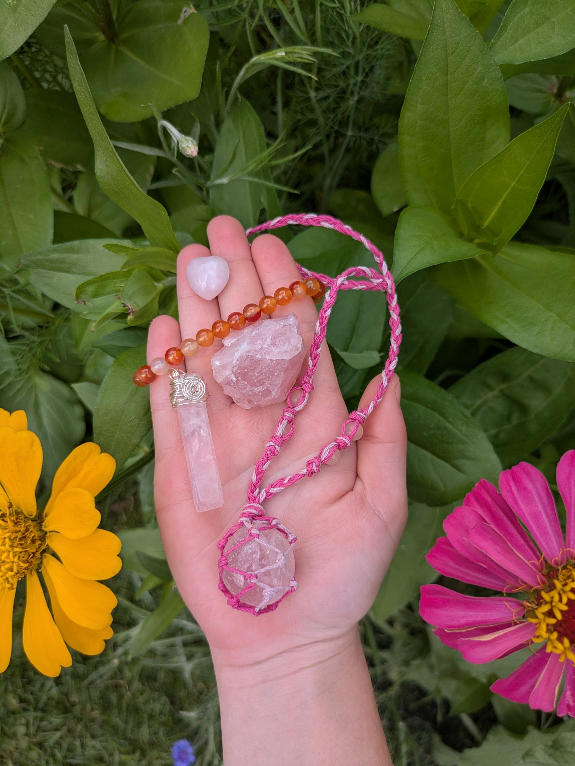 I am worthy. A powerful affermation to increase mood & lighten spirits. This box comes with a wire wrapped Rose Quartz pendant, a Carnelian bracelet, a carved Rose Quartz heart & a chunk of raw Rose quartz. Two dried lavender flowers clipped from my garden.ย ๐๐ธ๐ Rose quartz brings unconditional love to yourself & others. Creates a calm atmosphere, dispelling negativity. Encourages self forgiveness, self trust & self worth. Opens and unblocks the heart chakra. Carnelian is a stone that connects to the lower chakras. Meaning that it brings the metaphysical properties of being a gem that offers stability, grounding, a zest for life, and helps to improve confidence and creativity. A stabilising stone, Carnelian restores vitality and motivation, and stimulates creativity. It gives courage, promotes positive life choices, dispels apathy and motivates for success. Carnelian is useful for overcoming abuse of any kind. It helps in trusting yourself and your perceptions. It overcomes negative conditioning and encourages steadfastness. Carnelian improves analytic abilities and clarifies perception. It sharpens concentration and dispels mental lethargy. Protects against envy, rage and resentment. Calms anger, banishes emotional negativity and replaces it with a love of life. Carnelian boosts fertility and stimulates sexuality. ๐๐งก